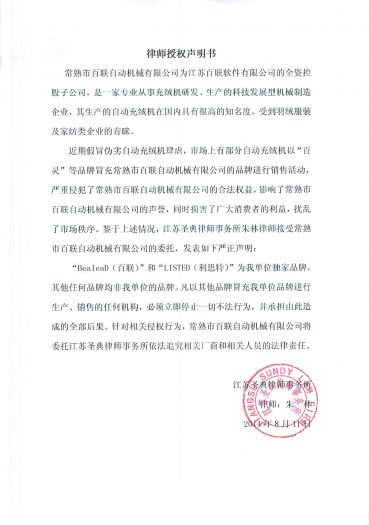 近期假冒偽劣自動充絨機肆虐,市場上有部分自動充絨機以“百靈”等品牌冒充常熟市百聯自動機械有限公司的品牌進行銷售活動,嚴重侵犯了常熟市百聯自動機械有限公司的合法權益,影響了常熟市百聯自動機械有限公司的聲譽,同時損害了廣大消費者的利益,擾亂了市場秩序。鑒于上述情況,江蘇圣典律師事務所朱林律師接受常熟市百聯自動機械有限公司的委托,發表如下嚴正聲明: