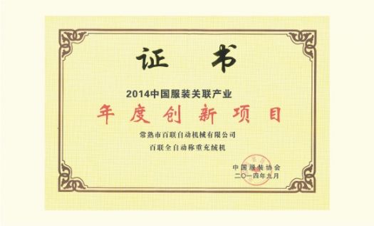 2014年度中國服裝大會暨新疆服裝產業發展高端論壇9月在新疆烏魯木齊隆重召開。中國服裝協會舉辦的“中國服裝關聯產業創新項目” 頒獎活動作為2014年度中國服裝大會的一項重要議程,9月5日,在烏魯木齊舉行。中國服裝協會會長王天凱、中國服裝協會名譽會長杜鈺洲兩位領導親自為十個優秀創新項目頒發了獎牌。常熟市百聯自動機械有限公司的“百聯全自動稱重充絨機”創新項目喜獲此殊榮,并入選《2014“中國服裝關聯產業創新項目”匯編》。
